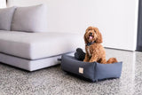 Hugo is pictured in his slate grey bed, against a light grey couch and mid grey flooring - a monochromatic palette