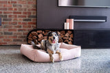 Pixel is pictured in a soft blush bed that is used as an accent colour against the dark toned walls and cupboards.